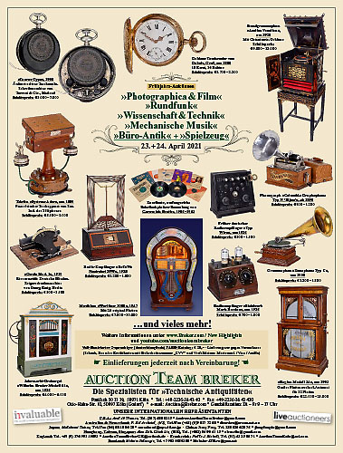 Welcome to The World's Leader & Record Holder of "Technical Antiques" ![]() The Specialists in »Technical Antiques & Fine Toys« We hold regular Specialty Auctions of »Mechanical Music Instruments« as well as »Science &Technology« and »Fine Toys & Automata«! ![]() Jetzt einliefern! Consigning now! Fantastic Spring Auction ![]()